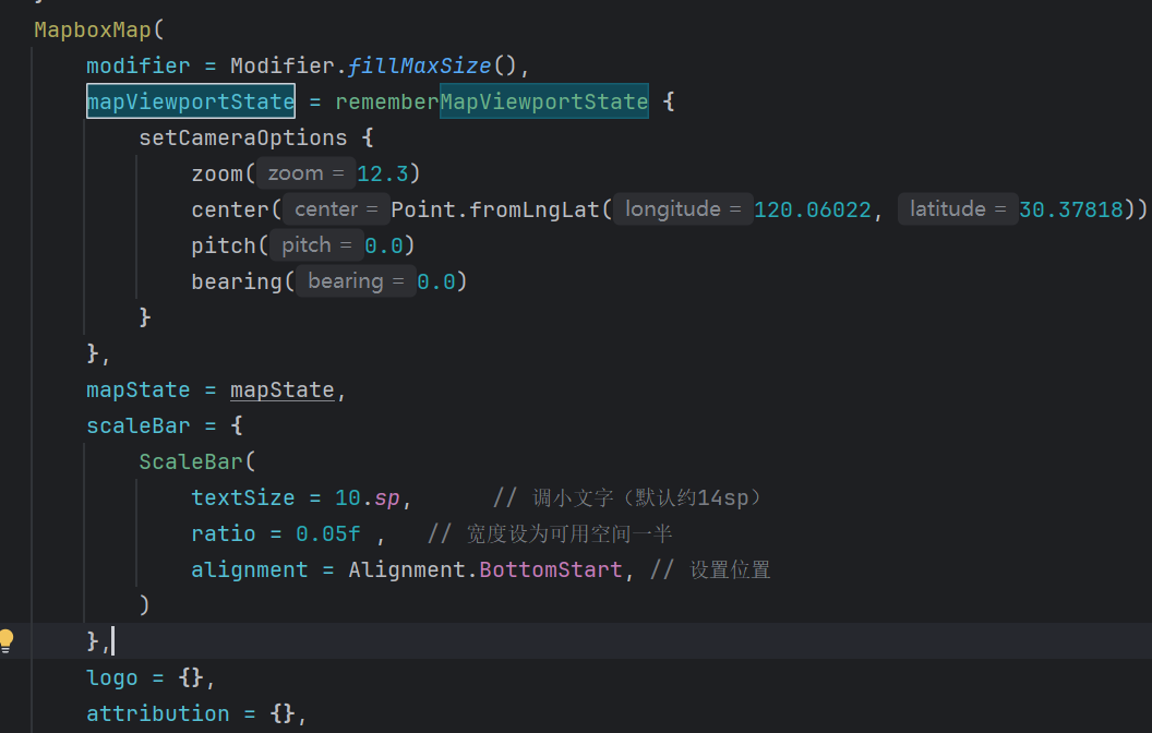 在 MapboxMap 初始化时,设置比例尺和 logo 的位置和样式。通过 ScaleBar 组件自定义比例尺的文本大小、宽高比和对齐方式。在示例中,将比例尺的文本大小设置为 10.sp,宽高比为 0.05f,并将其放置在左下角。通过将 logo 参数设置为一个空的 Box 组件,可以隐藏 logo。